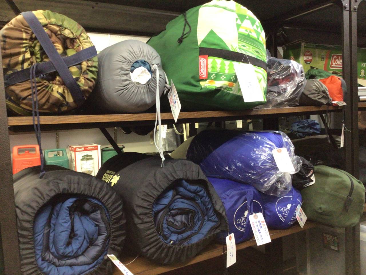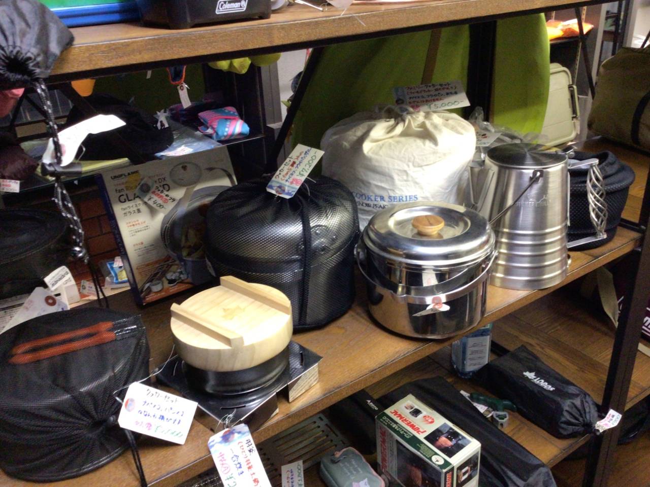 ざっくり在庫状況(10月3週目) 2025/10/14 昨日の名古屋は最高気温31℃でしたが、さすがに今年はもう30℃を超えることは無さそうです。みなさま長い夏お疲れさまでした…! さて、今週は衣料品がどっと入りました!最近あまり新しく入ってこなかったので、久しぶりですね。 特に冬物トレッキングパンツがごっそりあります。メンズLとかですが(^^; この写真でも既に4,5枚売れています。皆さん意外と衣料品狙っておられますね~ イスコーナーは変わらず瀕死…というか新たに2脚売れたので、いっそう瀕死です(^^; 残り4脚であまりに棚が寂しいので、下にクーラーボックスを突っ込んだ始末です。 雪崩を起こすほど椅子が積まれていた春が懐かしいです…(;;) クッカーコーナーは大きい物ばかり残っているのでビジュアル的には寂しくはなっていませんが、小さいクッカーがもうほとんどありません。 シェラカップやメスティンなんか邪魔なくらいあったはずですが、それらも全て捌けました。なんだかんだで根強いですね~ ファミリー用はUNIFLAMEやらsnowpeakやら謎ブランドやら、よりどりみどりですw 選択肢豊富なのはタープポール。DoDのハイパームテキとビックタープポール、snowpeakのウイングポール、FIELDOORと謎に充実のラインナップです! お値段もピンキリ。キャノピー用もいろいろあります。 いったん減ったものの持ち直したシュラフコーナー。 しかしお客様の視点になると「もう少し選択肢が欲しいな」と感じます。もう少し欲しいですね。 ただ安物の夏用化繊シュラフだけは余り気味なので、あまり有難くないです…。それ以外で…! 明日・明後日(水曜・木曜)は定休日です!ではまた金曜日(^^)